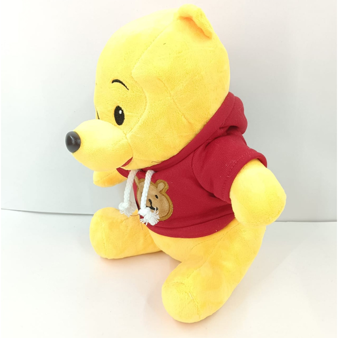 Adorable yellow bear plush wearing a bright red hoodie with drawstrings